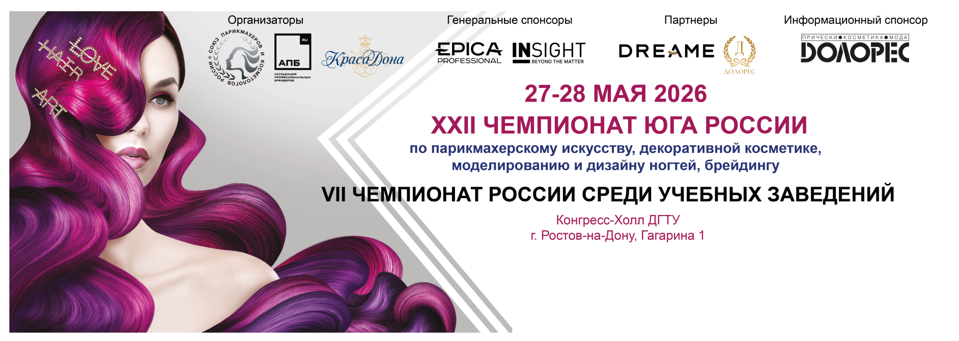 27-28 мая 2026 г. XXII чемпионат Юга России по парикмахерскому искусству, декоративной косметике, брейдингу. VII чемпионат России среди учебных заведений.